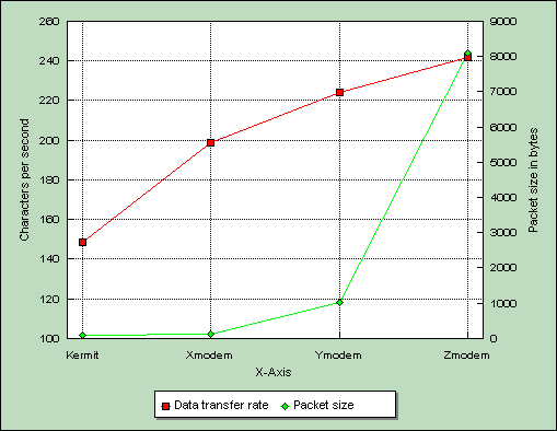 Since the extra delays come with each new packet, MNP protocol gets more and more effective as packet sizes increase and fewer packets are actually sent. Testing the full spectrum from Kermit to Zmodem, it showed that MNP protocol could provide high transfer rates for non-compressed data.