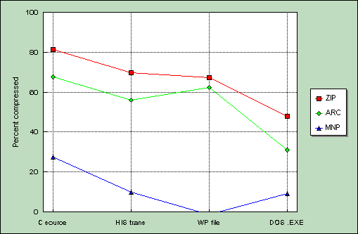 ARC, ZIP and MNP compression schemes accelerate data transmission by lowering the actual amount of data sent. Testing clearly shows that ZIP is by far the most successful compression mechanism across all types of data (Figure 3) and that for all file types, using ZIP compression on data before transmission over standard modems is the fastest possible transfer method.